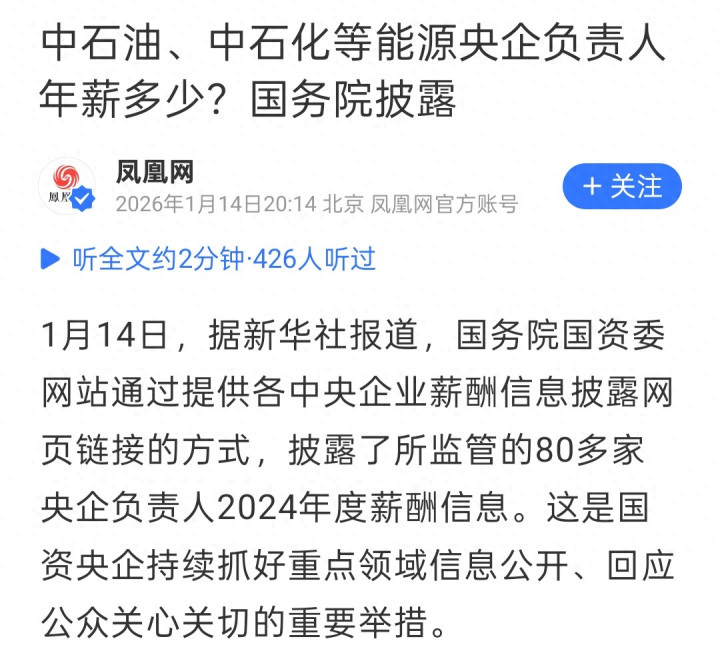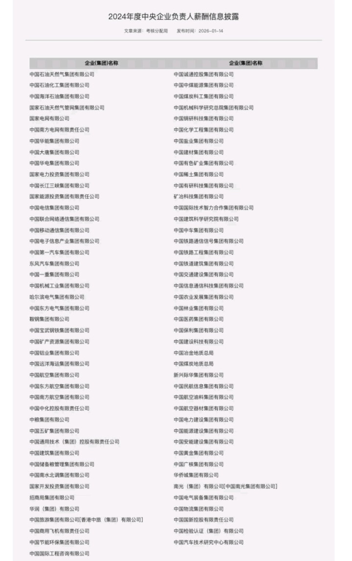 1月14日,据新华社报道,国务院国资委网站通过提供各中央企业薪酬信息披露网页链接的方式,披露了所监管的80多家央企负责人2024年度薪酬信息。