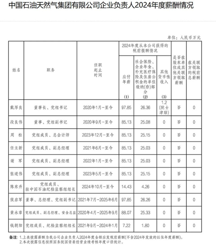 {jz:field.toptypename/}根据国务院国资委2024年度央企负责人薪酬披露信息,中国石油董事长戴厚良以97.85万元的年薪位居榜首,而国家管网总经理何仲文以80.02万元的年薪位列末位,差距接近18万元。