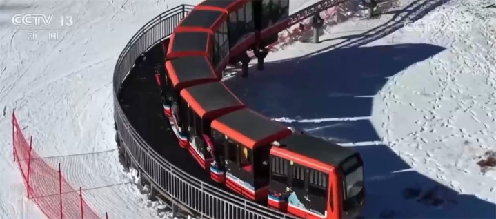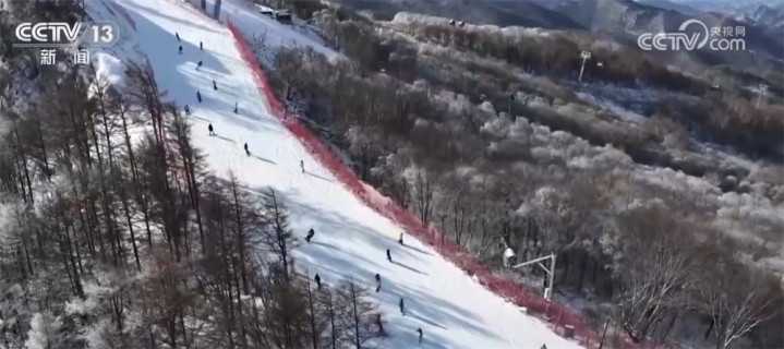 在河北滦平县金山岭银河滑雪场,游客们正在雪道上飞驰。除了滑雪,穿梭于雪场的“银河号”雪山专列和雪地里的冰屋火锅也成为新晋打卡点。