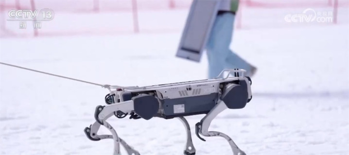 在湖北巴东一滑雪场,滑雪爱好者们脚蹬雪板,用牵引绳与四足机器狗相连,与机器狗一起滑行。