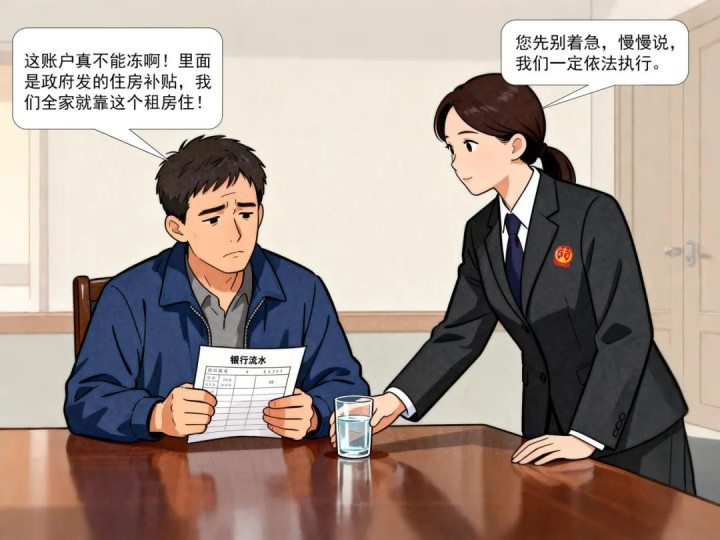 {jz:field.toptypename/}被执行人赵世算紧紧攥着银行流水单,手指发白,声音发颤:“法官,这账户真不能冻啊!里面是政府发的住房补贴,我们全家就靠这个租房住!要是取不出来,下个月房租交不上,我们一家就要睡大街了!”