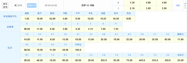 数据方面,闻明机构为本场比赛开出1.39(巴萨赢)4.85(平局)4.90(马竞赢)的数据组合,巴萨有望赢得告捷拯救一点面子。总进球玩法上,两边总进3球的赔率为1赔3.95,总进4球的赔率为1赔4.20,本场比赛有望打出精彩的对攻大战。尽管巴萨曾在欧冠献技过6-1逆转大巴黎的好戏,但在三将缺阵的情况底下对以“铁血防护”著称的马竞,巴萨本场比赛即使取胜,也很难再现往常逆转古迹。