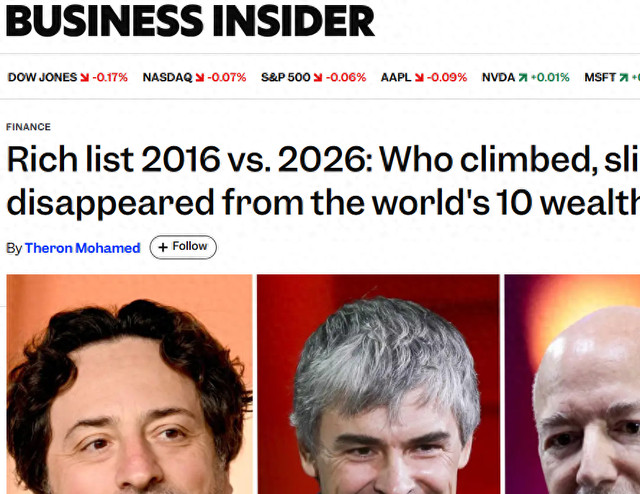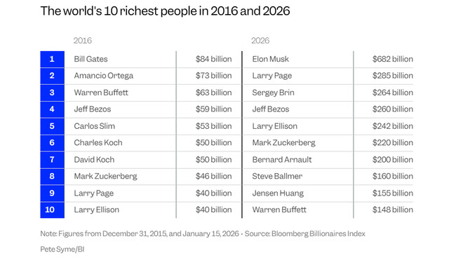 [环球网科技综合报道]1月17日消息,据《商业内幕》分析,过去十年全球富豪格局剧变,财富量级呈爆发式增长。2016年初全球前十富豪总身家不足6000亿美元,如今已飙升至2.6万亿美元,马斯克以6820亿美元身家登顶。