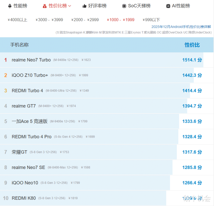 最新一期千元档性价比排名如下,前三名的手机分别有真我neo 7 Turbo、iqoo z10 Turbo+、红米Turbo 4,从个人经验来看,这几款确实值得入手。