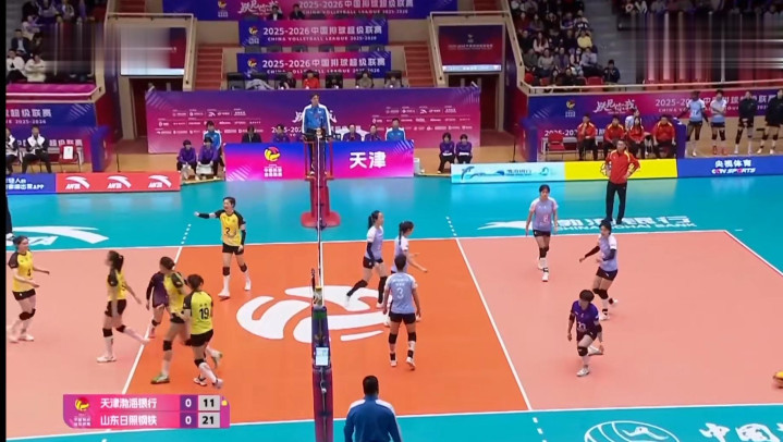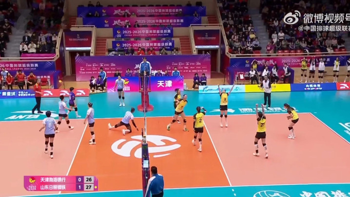 第四名天津女排对阵山东女排的比赛中,天津女排主场不敌山东女排。山东女排的副攻杨涵玉三号位快攻得手!